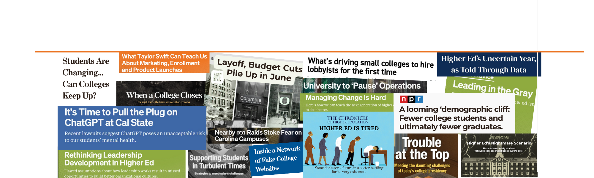 We work with university presidents, provosts, and senior leaders who are navigating transitions, restructuring efforts, and wrestling with the complexity of what’s next for their campus community.